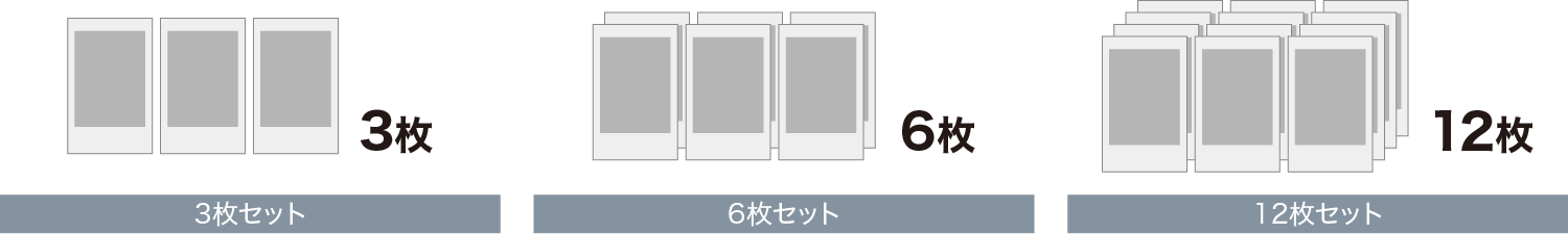 コンパクトサイズのチェキ(Instax™ mini)を、3枚、6枚、12枚のセットでお届けします。